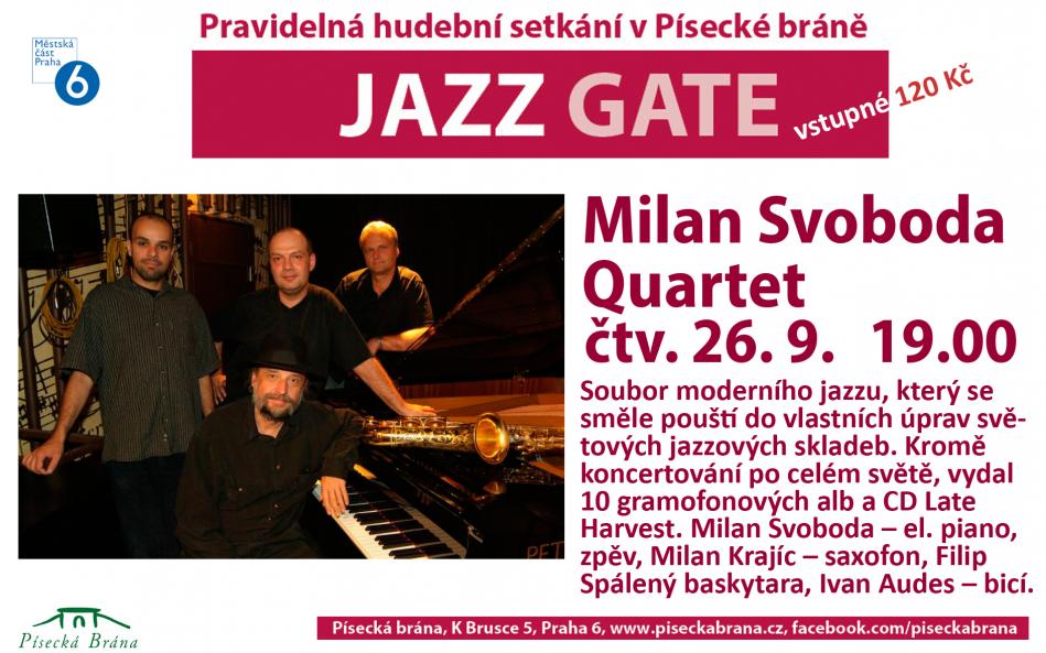 Podzimní Jazz Gate v Písecké bráně otevře známý jazzman Milan Svoboda - el. piáno a zpěv, spolu s Milanem Krajícem – saxofon, Filipem Spáleným - baskytara, Ivanem Audesem – bicí. Quartet.