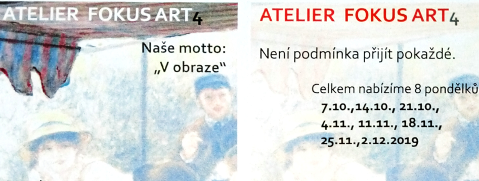 Tvůrčí atmosféra našeho atelieru je tu pro vás v pondělní večery od 17:00 do 19:30 hodin (od 7. 10. do 2. 12. 2019, 8 pondělků). Motto zní tentokrát "V obraze." Velká část každého setkání je volná výtvarná činnost, ale nejen to: podíváme se na obraz, vytvoříme obraz, vstoupíme do obrazu, rozehrajeme obraz a budeme v obraze. :- )Není podmínkou přijít na všech 8 setkání!Díky Magistrátu vstup zdarma.
