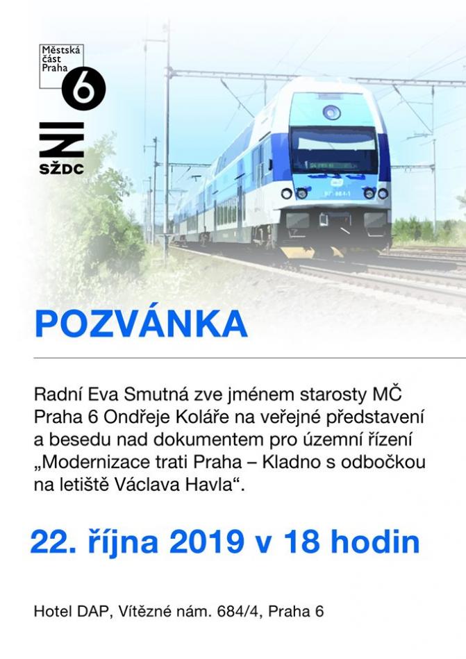 Radní MČ Praha 6 Ing. arch. Eva Smutná, FEng. zve jménem starosty MČ Praha 6 Mgr. Ondřeje Koláře na veřejné představení a besedu nad dokumentem pro územní řízení "Modernizace trati Praha - Kladno s odbočkou na letiště Václava Havla".
