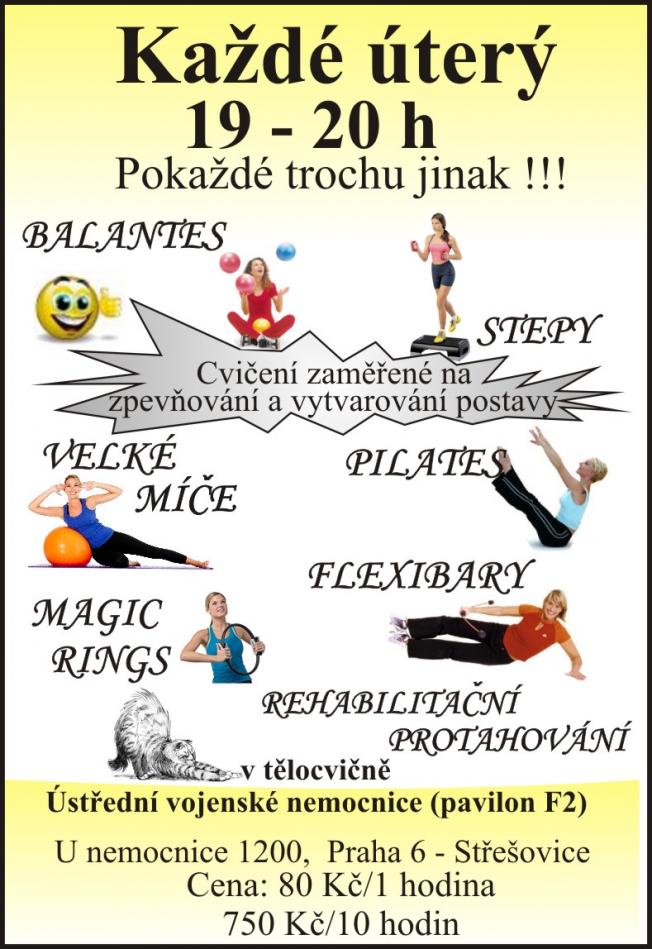 A aby vám nebylo smutno o víkendech, máte možnost si zacvičit i některé soboty dopoledne od 9:30 do 11:00 hod. rovněž v tělocvičně Ústřední vojenské nemocnice, pavilon F2 - první sobotní cvičení bude 9. 11. 2019.