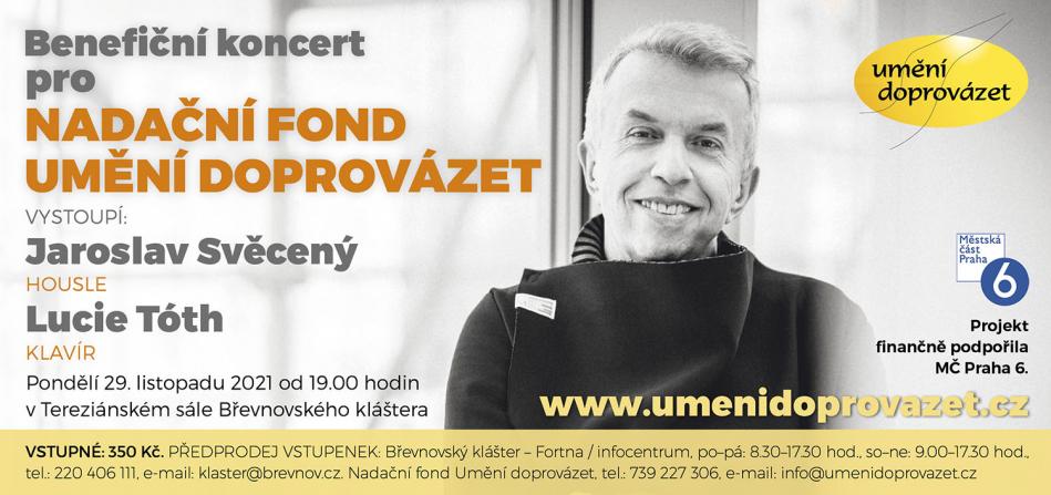 Nadační fond Umění doprovázet vás srdečně zve na tradiční benefiční koncert houslového virtuosa Jaroslava Svěceného, který pro nadační fond vystoupí za doprovodu klavíristky Lucie Tóth v pondělí 29. listopadu 2021 v Tereziánském sále Břevnovského kláštera.