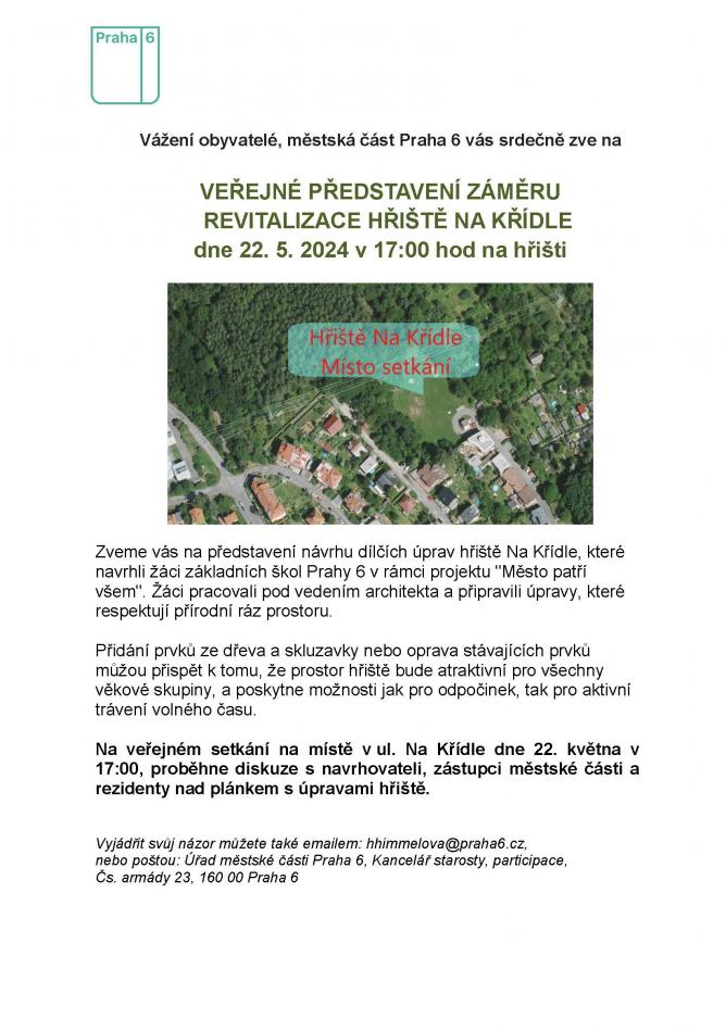 Zveme vás na představení návrhu dílčích úprav hřiště Na Křídle ve stejnojmenné ulici ve Vokovicích. Na setkání proběhne diskuze s navrhovateli, zástupci městské části a rezidenty nad plánkem s úpravami hřiště. Úpravy navrhli žáci základních škol Prahy 6 v rámci projektu "Město patří všem". Žáci pracovali pod vedením architekta a připravili úpravy, které respektují přírodní ráz prostoru.