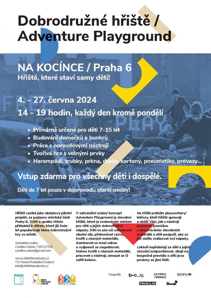 Celý červen je otevřeno ukázkové dobrodružné hřiště Na Kocínce (Adventure Playground), které si děti staví samy. Zveme děti i jejich rodiče k jeho návštěvě kdykoli v otvíracích hodinách 4.–27. června, vždy od úterý do neděle od 14 do 19 hodin.