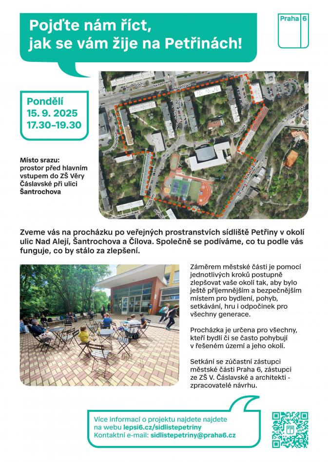 Zveme vás na procházku po veřejných prostranstvích sídliště Petřiny v okolí ulic Nad Alejí, Šantrochova a Čílova. Společně se podíváme, co tu podle vás funguje, co by stálo za zlepšení.
