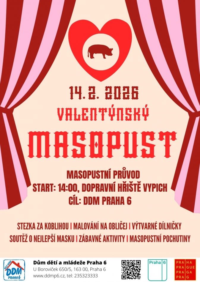 Přijďte si užít den plný barev, masek a dobré nálady! Spojili jsme láskyplný Valentýn s tradičním masopustním veselím a připravili pro vás zábavný program, který potěší celou rodinu. Zveme všechny malé i velké na masopustní veselí!