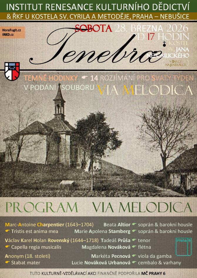V předvečer Květné neděle Vás zveme do malebného kostelíku v údolí Šárky. Při koncertě Tenebrae zazní 14 hudebních rozjímání pro Svatý týden. Na programu jsou skladby z českých barokních kancionálů, Tristis est anima mea od M. A. Charpentiera, Stabat Mater a další.